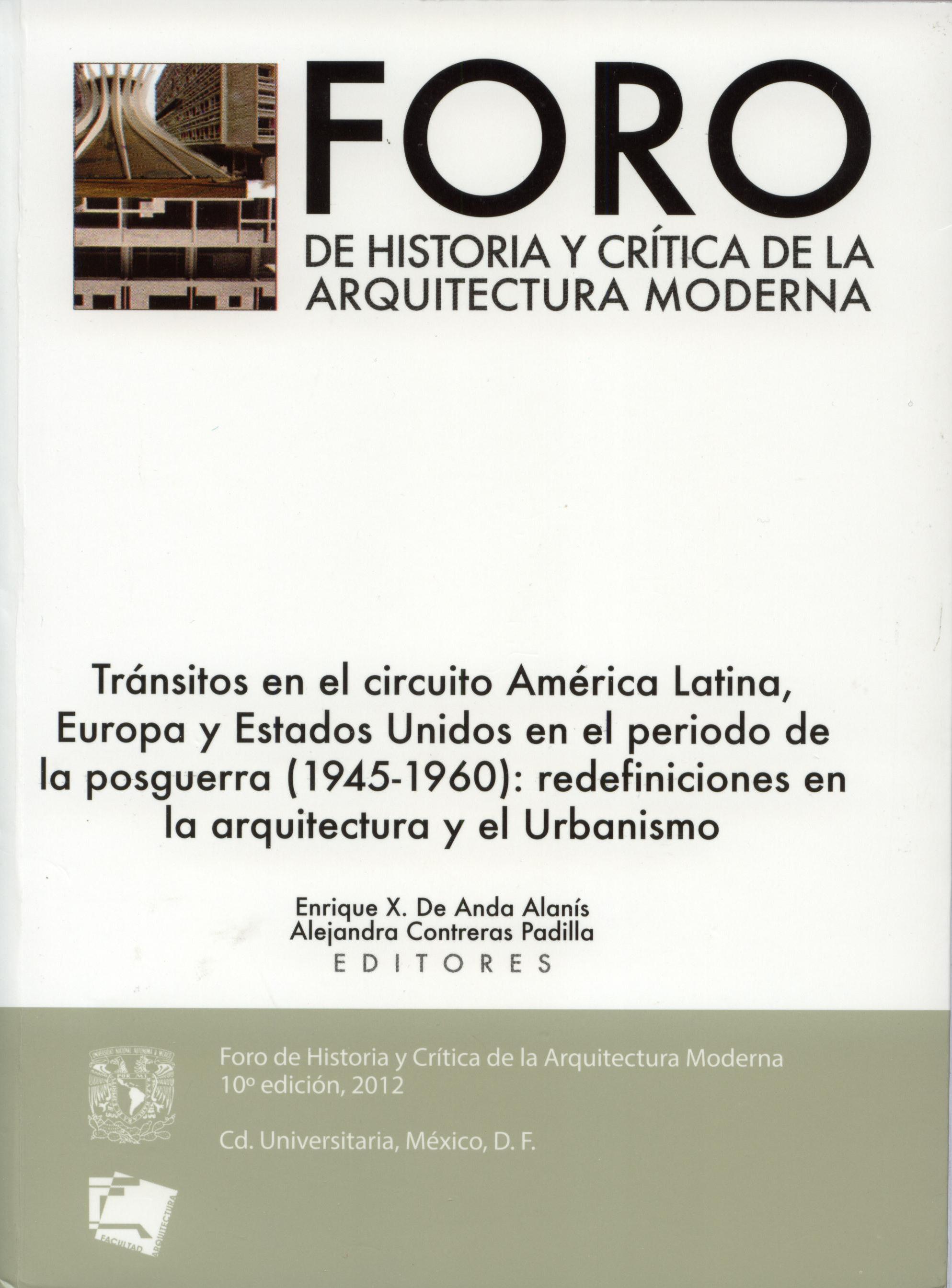 Foro de Historia y Crítica de la Arquitectura Moderna. Tránsitos en el circuito América Latina, Europa y Estados Unidos en el periodo de la posguerra (1945-1960): redefiniciones en la Arquitectura y el Urbanismo. Enrique X. de Anda Alanis y Alejandra Contreras Padilla (eds.), Facultad de Arquitectura, UNAM, 2014. Introducción. Autor: Enrique X. de Anda Alanis Experiencias en la historia y la teoría de la arquitectura moderna y las ciudades de México y América Latina. Del optimismo por las vanguardias a los intentos constructivistas. Ponencia magistral del Dr. Rafael López Rangel |