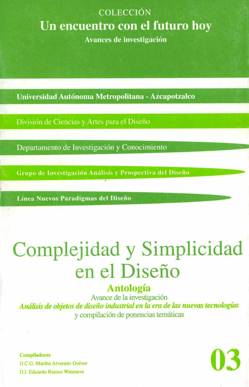 Complejidad y simplicidad en el diseño. Antología: Avance de la investigación "Análisis de objetos de diseño industrial en la era de las nuevas tecnologías" y compilación de ponencias temáticas. Compiladores: Martha Alvarado Dufour / Eduardo Ramos Watanave. Colección: Un encuentro con el futuro hoy. Avances de investigación No. 3. UAM-Az, CYAD, Departamento de Investigación y Conocimiento, Grupo de Investigación Análisis y Prospectiva del Diseño, Línea Nuevos Pradigmas del Diseño, México, 2001. |